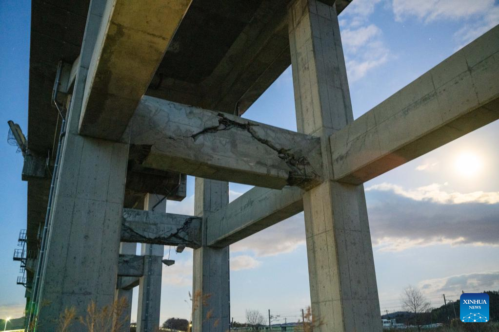 Photo taken on March 17, 2022 shows a damaged bridge after an earthquake in Shiroishi City of Miyagi Prefecture, Japan. A 7.3-magnitude earthquake hit northeastern Japan on late Wednesday night. (Xinhua/Zhang Xiaoyu)