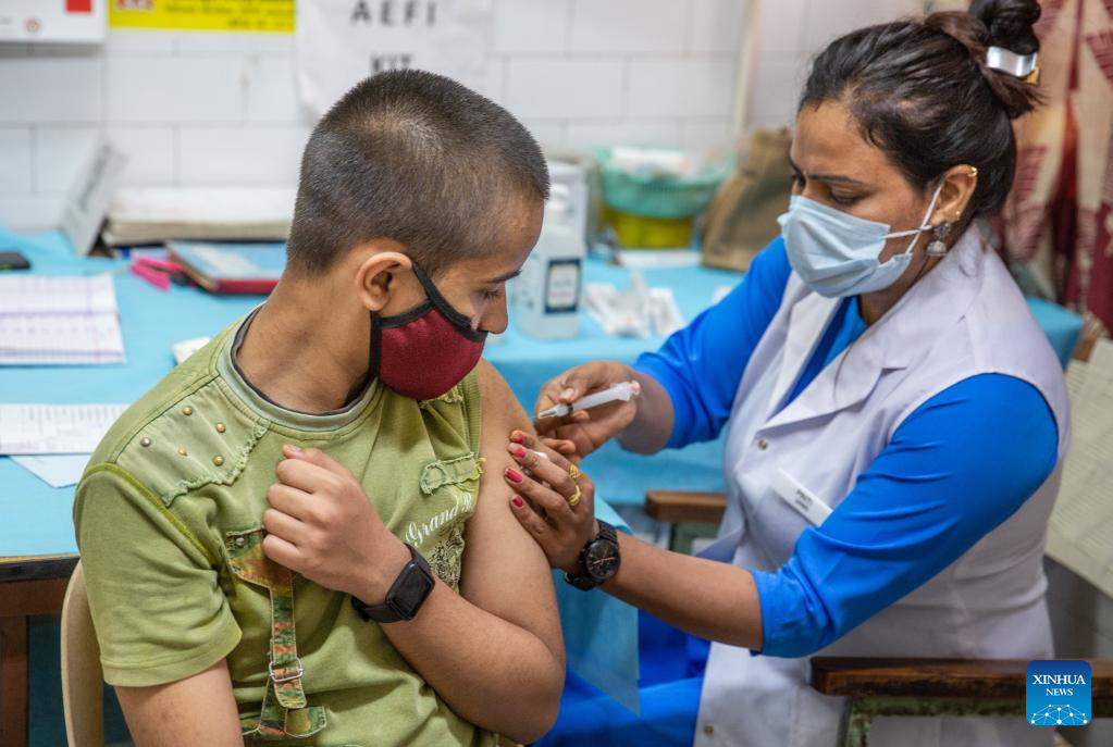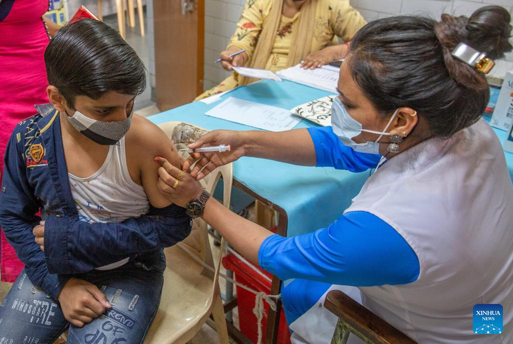A boy receives a dose of COVID-19 vaccine at a health center in New Delhi, India, March 16, 2022. Vaccination of children in the 12-14 age group began on Wednesday in India. (Xinhua/Javed Dar)