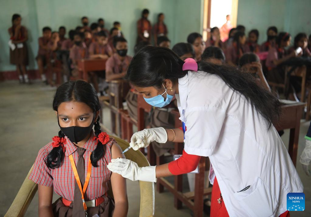 A medical worker administers a dose of COVID-19 vaccine to a girl at a school on the outskirts of Agartala, the capital city of India's northeastern state of Tripura, March. 16, 2022. Vaccination of children in the 12-14 age group began on Wednesday in India. (Str/Xinhua)