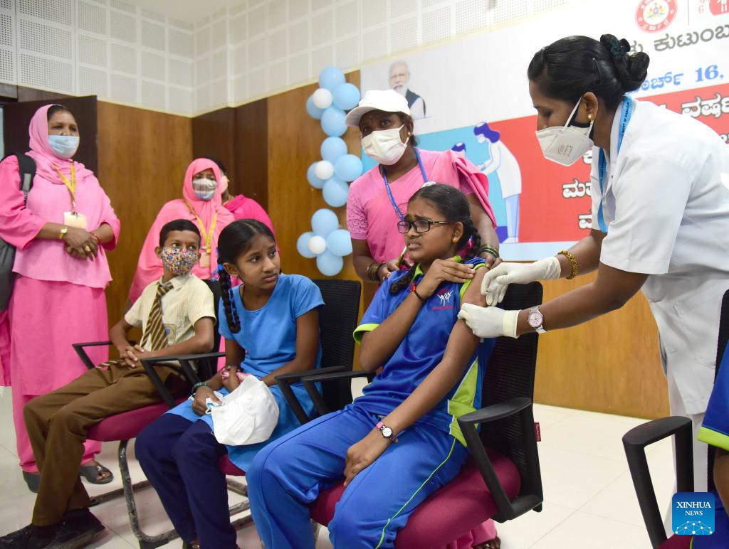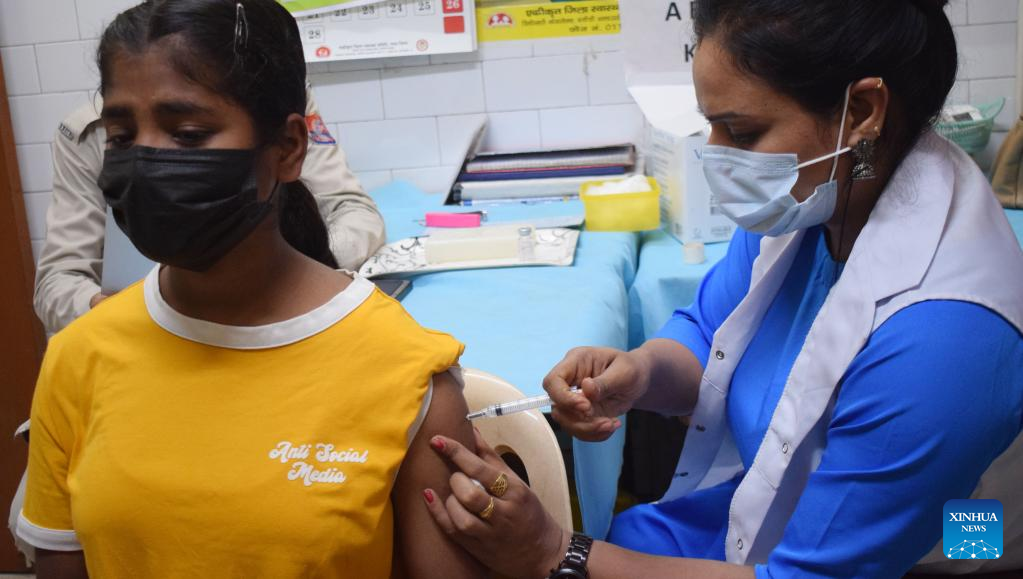 A medical worker administers a dose of COVID-19 vaccine to a girl in Bangalore, India, March 16, 2022. Vaccination of children in the 12-14 age group began on Wednesday in India. (Str/Xinhua)