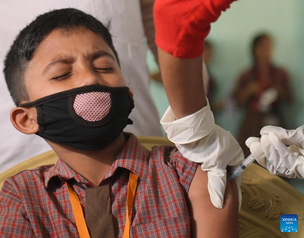 A boy receives a dose of COVID-19 vaccine in a school on the outskirts of Agartala, the capital city of India's northeastern state of Tripura, March. 16, 2022. Vaccination of children in the 12-14 age group began on Wednesday in India. (Str/Xinhua)