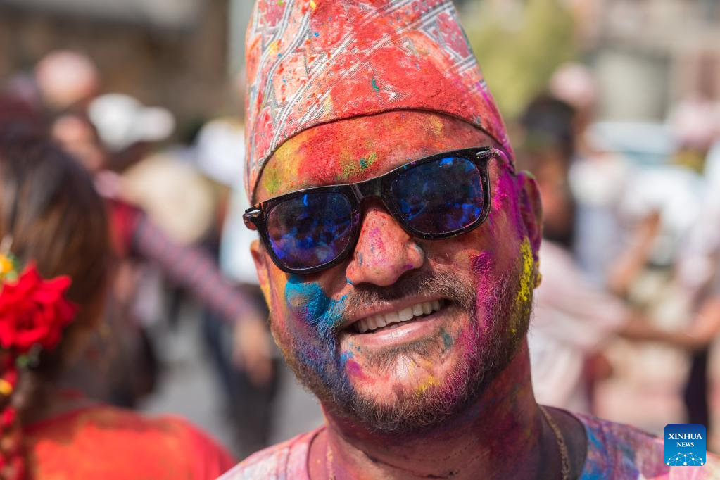 People celebrate Holi, the festival of colors, in Kathmandu, Nepal, March 17, 2022. (Photo by Sulav Shrestha/Xinhua)