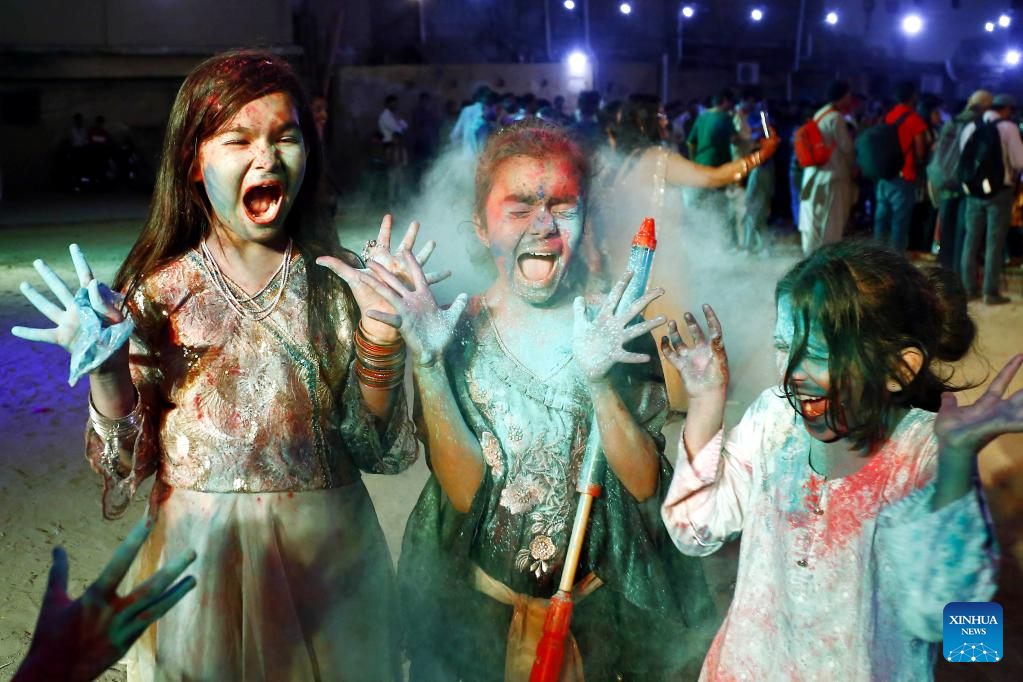 Children participate in celebrations of Holi festival, the festival of colors, in Karachi, Pakistan, on March 17, 2022. (Str/Xinhua)