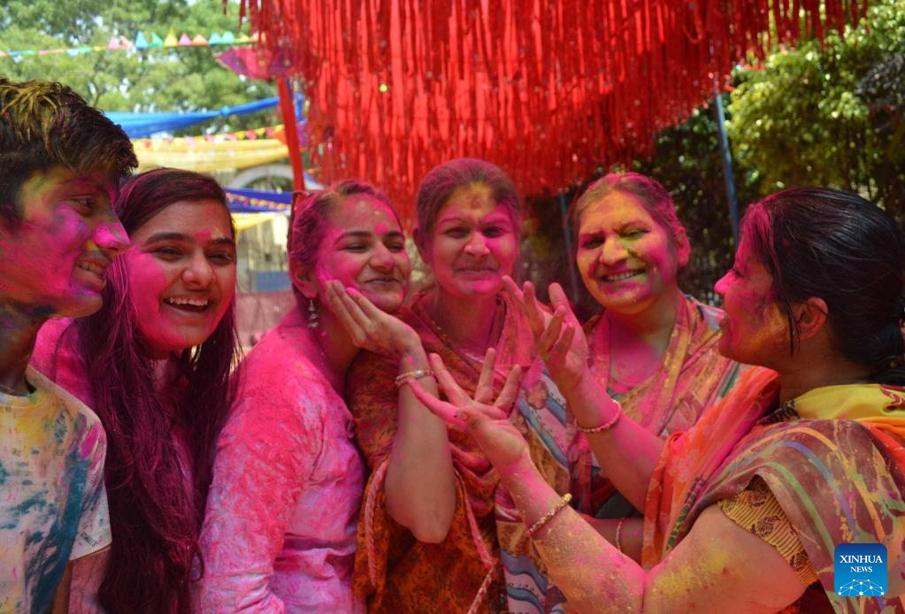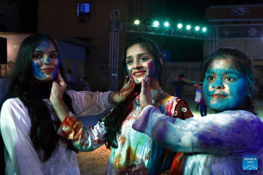 People participate in celebrations of Holi festival, the festival of colors, in Karachi, Pakistan, on March 17, 2022. (Str/Xinhua)