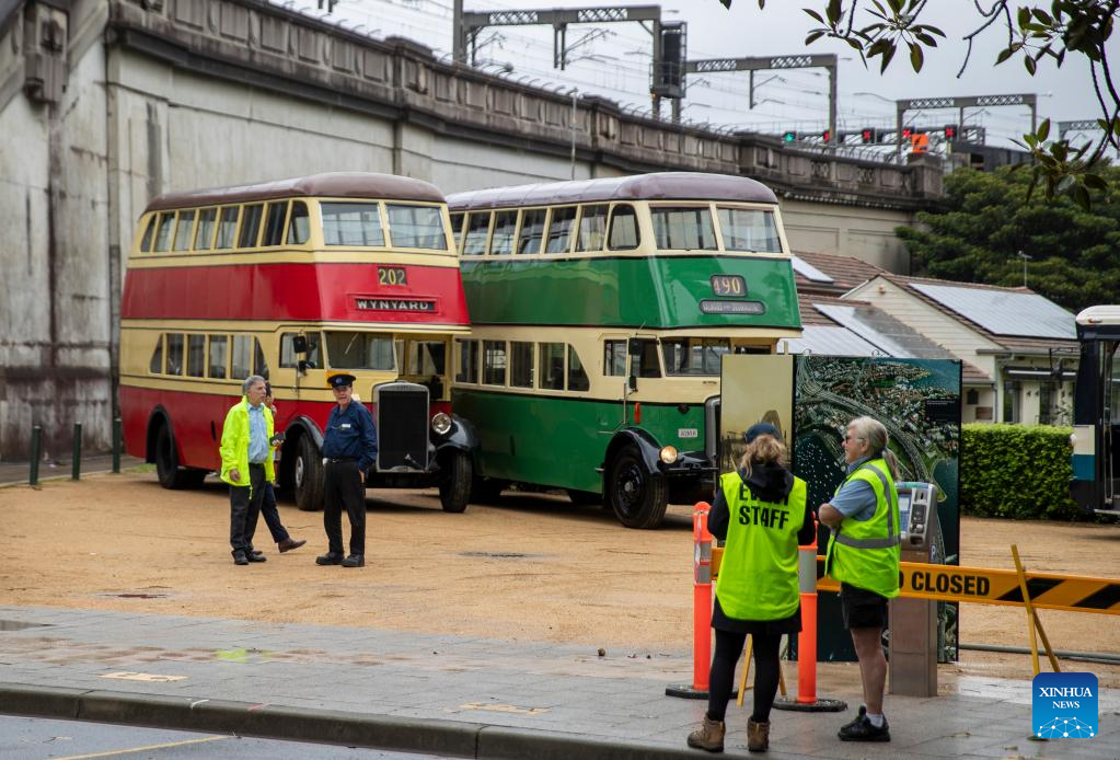 Vintage buses stop near Harbour Bridge in Sydney, Australia, on March 19, 2022, as part of the Sydney Harbour Bridge 90th anniversary celebration. To mark the 90th year since the completion of Sydney Harbour Bridge, Sydneysiders headed into the harbour on Saturday to pay homage to the bridge that has connected and inspired generations of Australians. (Xinhua/Bai Xuefei)