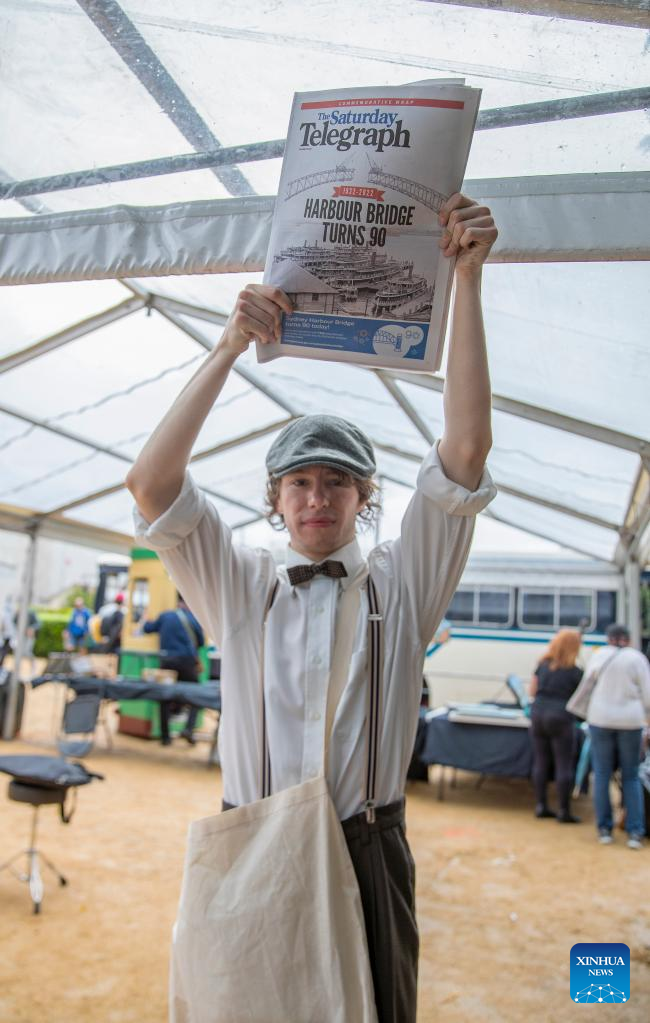 A costumed newspaper salesman shows a newspaper near Harbour Bridge in Sydney, Australia, on March 19, 2022, as part of the Sydney Harbour Bridge 90th anniversary celebration. To mark the 90th year since the completion of Sydney Harbour Bridge, Sydneysiders headed into the harbour on Saturday to pay homage to the bridge that has connected and inspired generations of Australians. (Xinhua/Bai Xuefei)