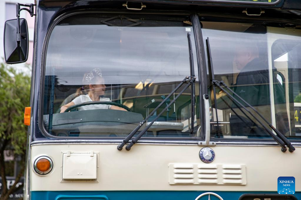 A girl experiences vintage bus driving near Harbour Bridge in Sydney, Australia, on March 19, 2022, as part of the Sydney Harbour Bridge 90th anniversary celebration. To mark the 90th year since the completion of Sydney Harbour Bridge, Sydneysiders headed into the harbour on Saturday to pay homage to the bridge that has connected and inspired generations of Australians. (Xinhua/Bai Xuefei)