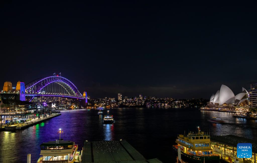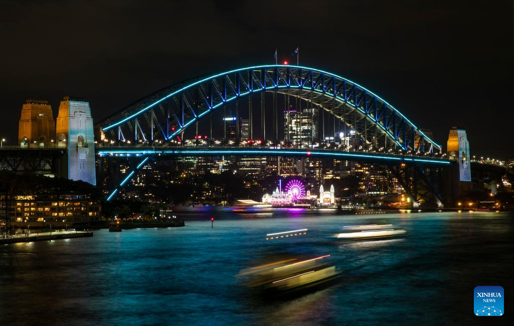 Photo taken on March 18, 2022 shows vivid light on Harbour Bridge in Sydney, Australia, as part of the Sydney Harbour Bridge 90th anniversary celebration. To mark the 90th year since the completion of Sydney Harbour Bridge, Sydneysiders headed into the harbour on Saturday to pay homage to the bridge that has connected and inspired generations of Australians. (Xinhua/Bai Xuefei)
