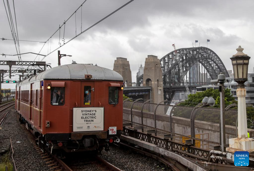 A vintage train passes Harbour Bridge in Sydney, Australia, on March 19, 2022, as part of the Sydney Harbour Bridge 90th anniversary celebration. To mark the 90th year since the completion of Sydney Harbour Bridge, Sydneysiders headed into the harbour on Saturday to pay homage to the bridge that has connected and inspired generations of Australians. (Xinhua/Bai Xuefei)