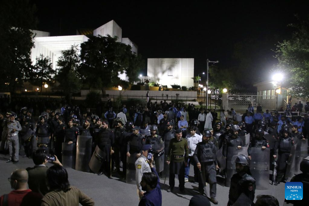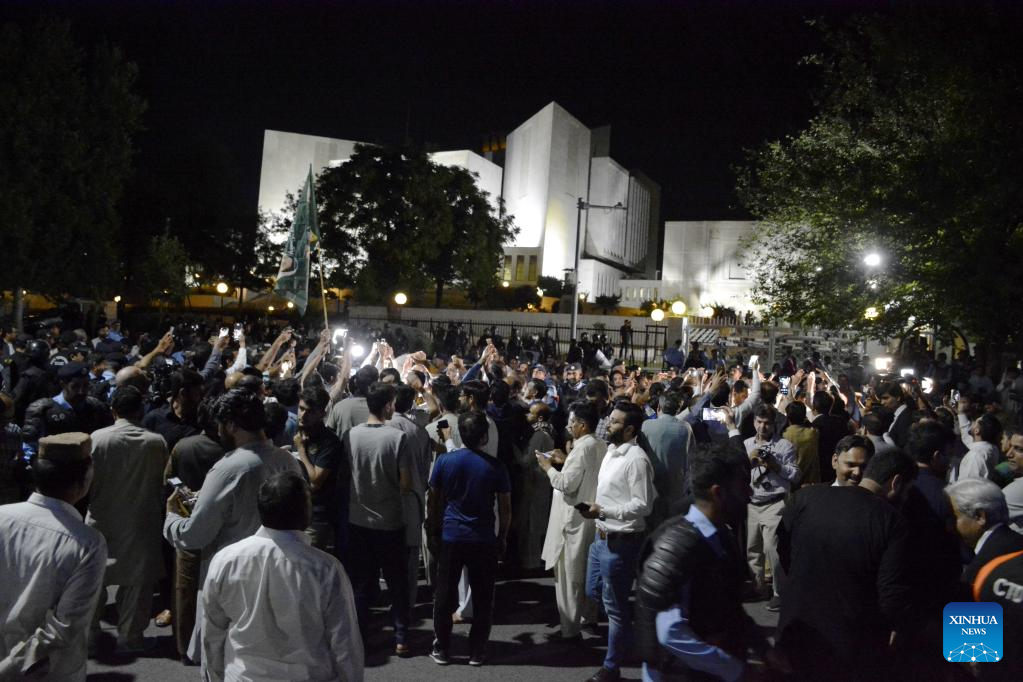 People gather outside the Supreme Court building in Islamabad, capital of Pakistan, on April 7, 2022. The Pakistani Supreme Court on Thursday declared Pakistani President Arif Alvi's decision to dissolve the National Assembly contrary to the Constitution and restored the government. (Str/Xinhua)