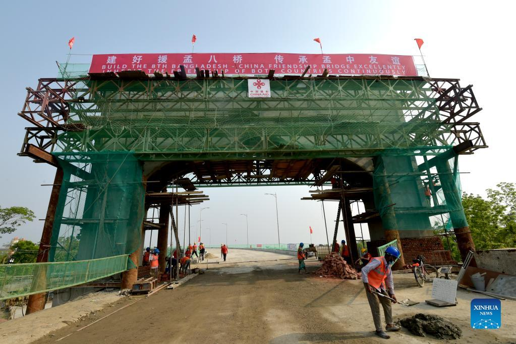 Photo taken on March 23, 2022 shows an Islamic structural design at the main gate of the eighth Bangladesh-China Friendship Bridge under construction in Pirojpur, Bangladesh. China Railway 17th Bureau Group Co. Ltd. is constructing the bridge over Kocha River in Pirojpur district, 185 km southwest of Dhaka, under the management of China Railway Major Bridge Reconnaissance & Design Institute Co. Ltd. (Xinhua)