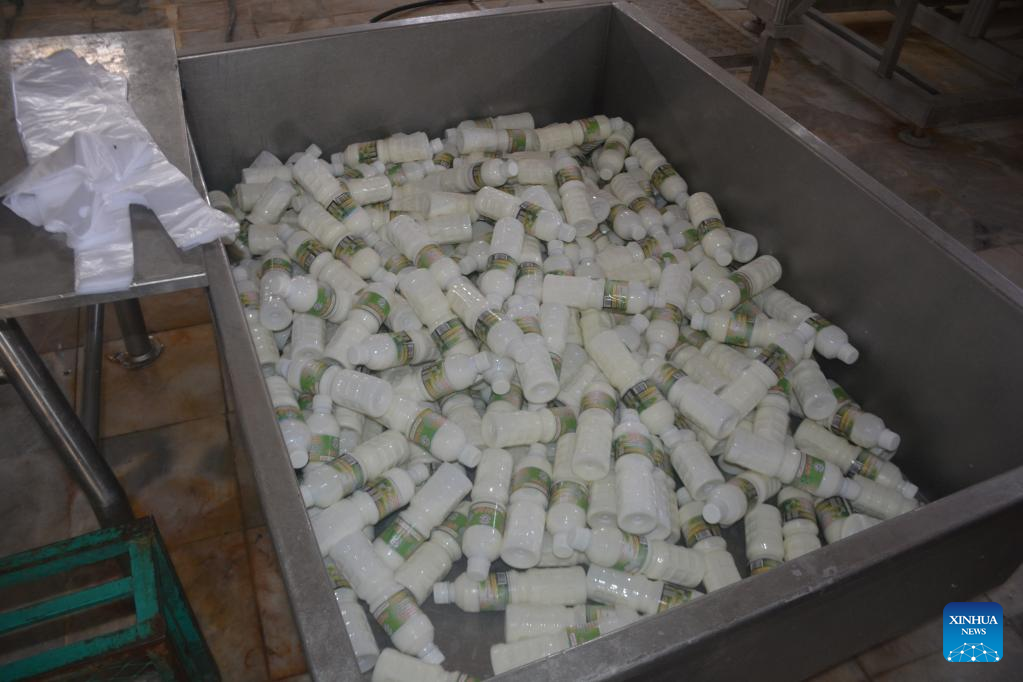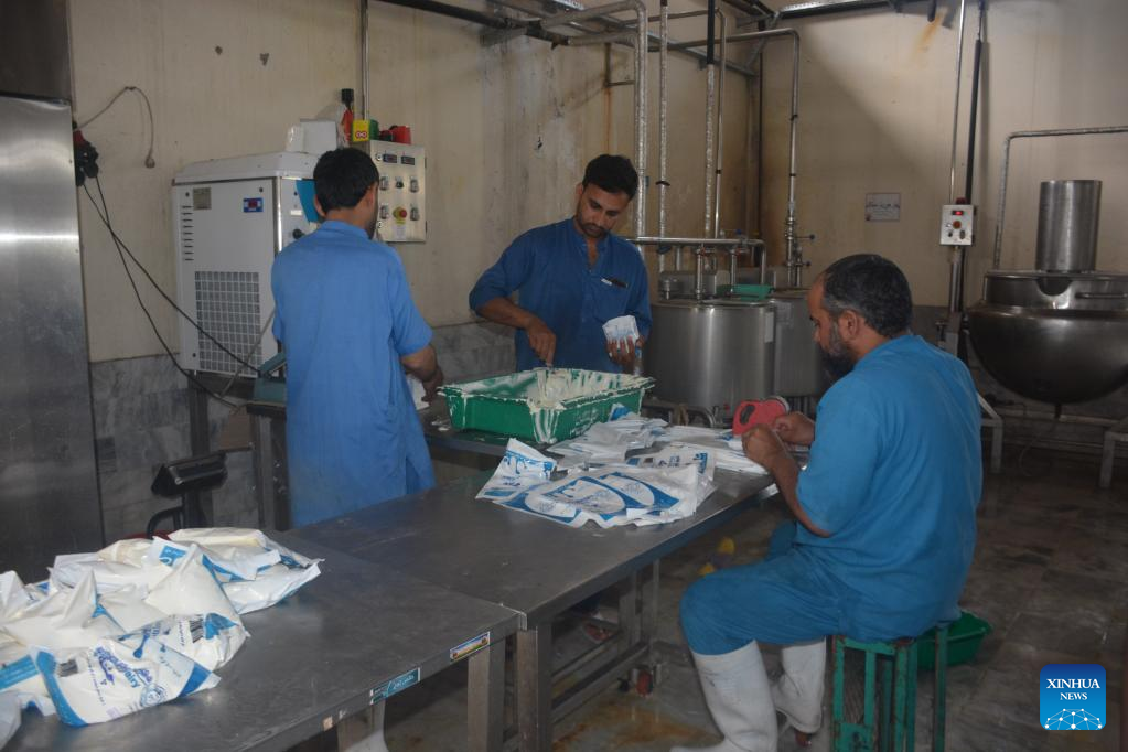 People work in a dairy plant in Jalalabad, Afghanistan, April 16, 2022. Khatiz Labaniat (Eastern Dairy) is the only dairy plant in Afghanistan's eastern region. The factory collects milk from 1,500 villagers living around Jalalabad and can process 5,000 liters of milk per day. TO GO WITH "Feature: Cash cows, Afghanistan's dairy farmers struggle to meet demand" (Photo by Hamidullah/Xinhua)
