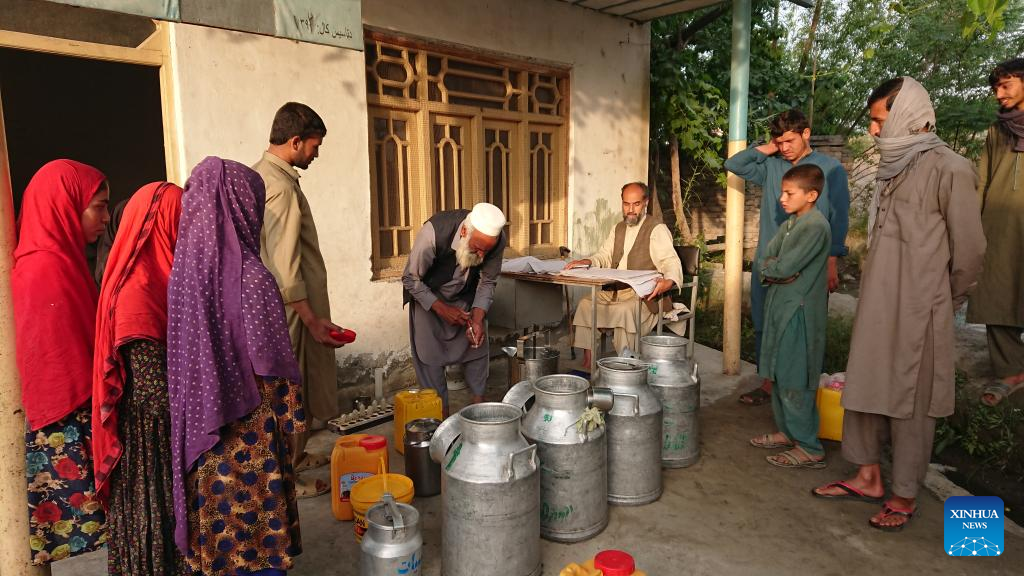 Villagers sell milk to a dairy plant in Jalalabad, Afghanistan, April 17, 2022. Khatiz Labaniat (Eastern Dairy) is the only dairy plant in Afghanistan's eastern region. The factory collects milk from 1,500 villagers living around Jalalabad and can process 5,000 liters of milk per day. TO GO WITH "Feature: Cash cows, Afghanistan's dairy farmers struggle to meet demand" (Photo by Hamidullah/Xinhua)