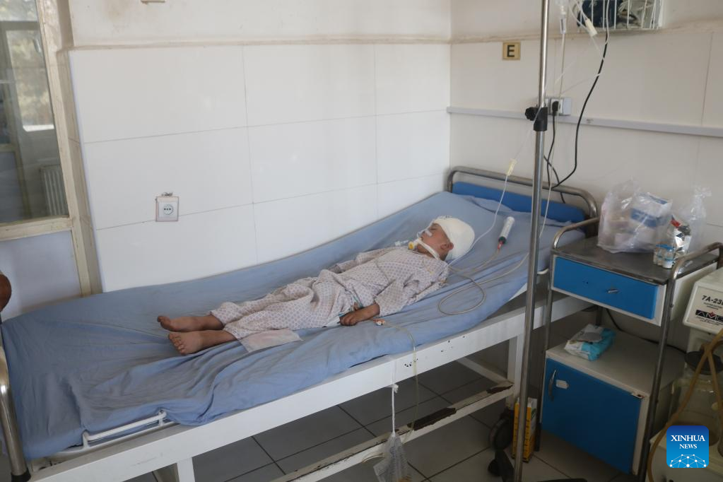 An injured child is treated at a local hospital after a blast at a mosque in Kunduz, Afghanistan, April 23, 2022. At least 33 people were killed and 43 others wounded after a blast rocked a mosque in Afghanistan's northern province of Kunduz on Friday, chief spokesman of the Taliban-led caretaker government Zabihullah Mujahid said. (Photo by Aimal kakr/Xinhua)