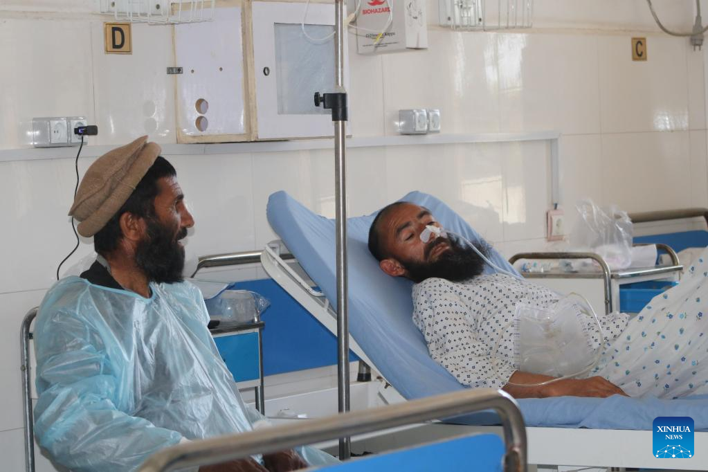 An injured man is treated at a local hospital after a blast at a mosque in Kunduz, Afghanistan, April 23, 2022. At least 33 people were killed and 43 others wounded after a blast rocked a mosque in Afghanistan's northern province of Kunduz on Friday, chief spokesman of the Taliban-led caretaker government Zabihullah Mujahid said. (Photo by Aimal kakr/Xinhua)