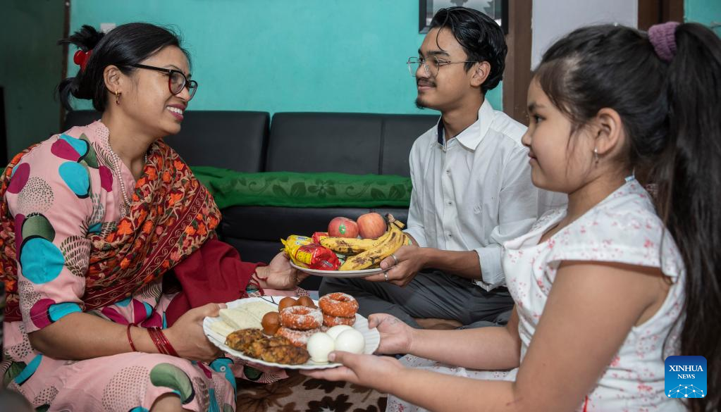 Children offer sweets and fruits to their mother on the occasion of Mother's Day in Kathmandu, Nepal, April 30, 2022. (Photo by Hari Maharjan/Xinhua)