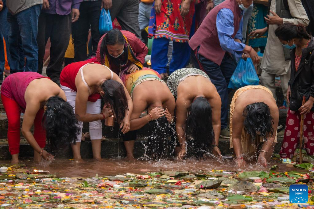 Nepalese Hindu devotees bathe in the pond, make offerings and pay homage to their departed mothers as they mark the Mother's Day in Nepal. (Photo by Hari Maharjan/Xinhua)