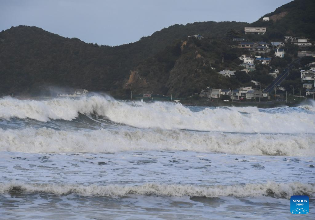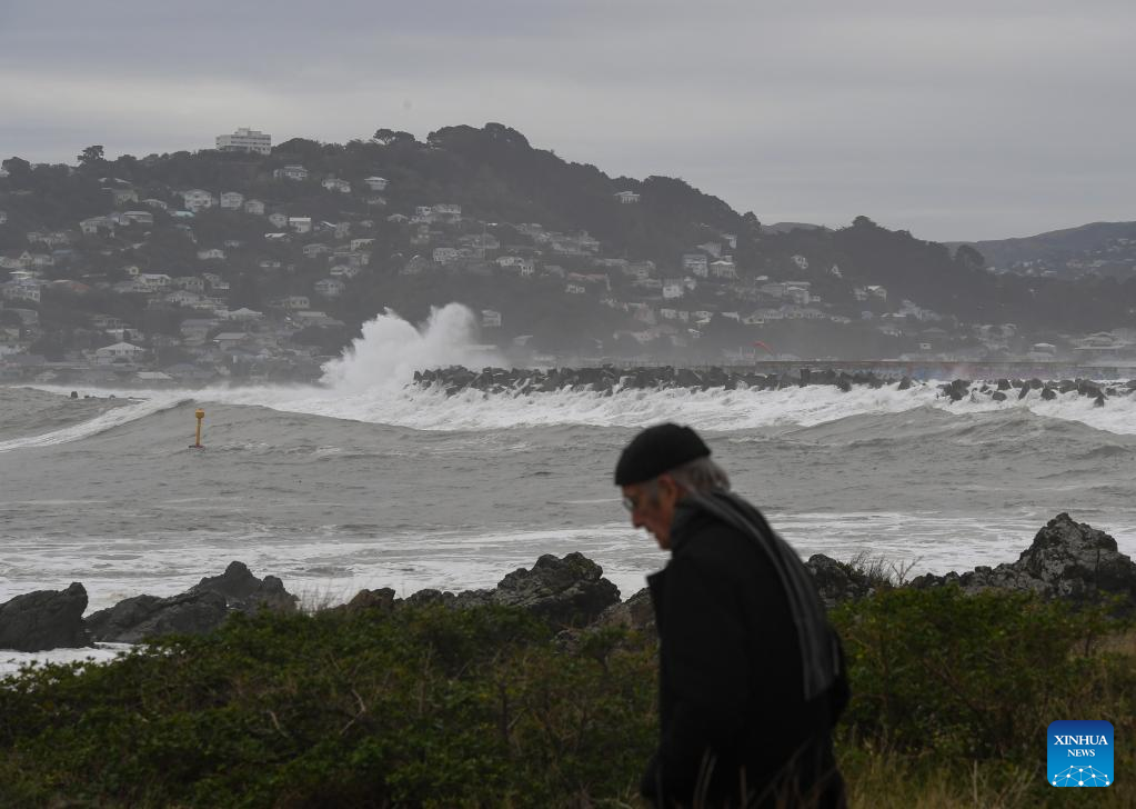 File photo taken on June 30, 2021 shows huge waves hitting the southern suburbs of Wellington, capital of New Zealand. New sea-level rising data released on Monday showed that large parts of New Zealand will see the speed of sea-level rising double, 20 to 30 years faster than previously expected. (Xinhua/Guo Lei)