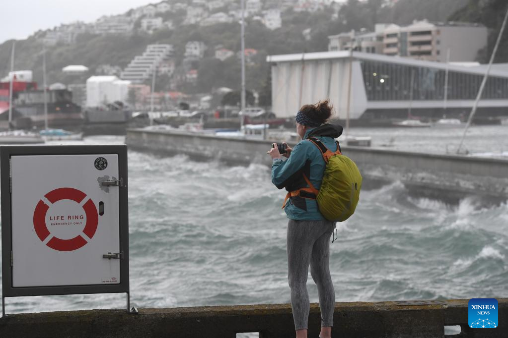 File photo taken on Jan. 19, 2021 shows a woman taking photos when huge waves hitting the coast line of downtown Wellington, New Zealand. New sea-level rising data released on Monday showed that large parts of New Zealand will see the speed of sea-level rising double, 20 to 30 years faster than previously expected. (Xinhua/Guo Lei)