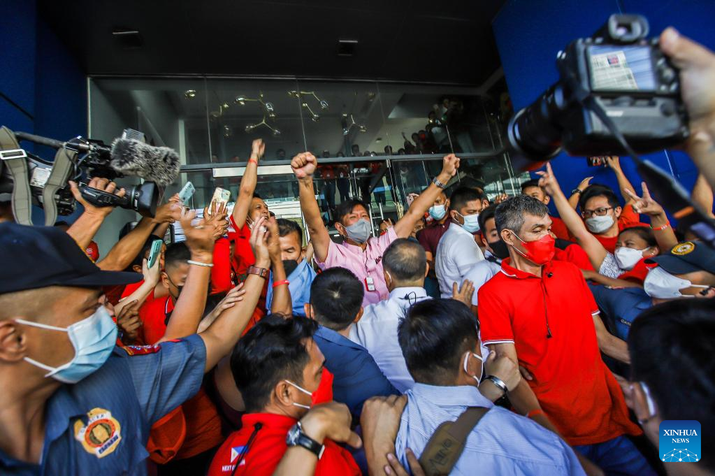 Presidential candidate Ferdinand Marcos Jr. greets his supporters at the campaign headquarters in Mandaluyong City, the Philippines on May 11, 2022. Marcos won a landslide victory in Monday's Philippine presidential election. (Str/Xinhua)