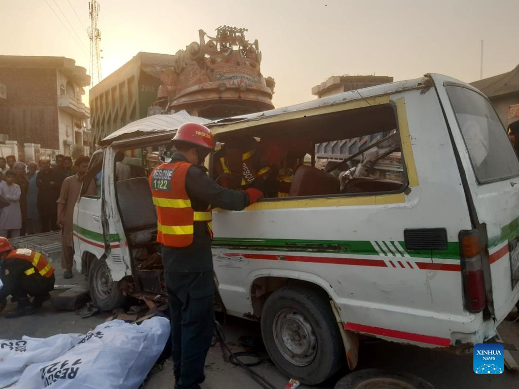 Cellphone photo taken on May 13, 2022 shows rescuers working at a road accident site in Gujranwala district of Pakistan's eastern Punjab province. At least 12 people were killed and 10 others injured in a road accident on Friday in Gujranwala district of Pakistan's eastern Punjab province, local media reported. According to the reports, the accident took place in the early hours when a speeding dumper truck crashed with two passenger vans one after the other on Hafizabad road near Gujranwala's Kot Ladha area. (Str/Xinhua)