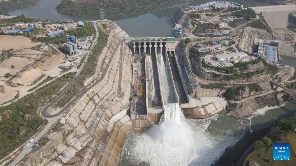 Aerial photo taken on May 24, 2022 shows the dam and spillway of the Karot Hydropower Project in Punjab province, eastern Pakistan. Pakistani Prime Minister Shahbaz Sharif said on Wednesday that the Karot Hydropower Project, a major pilot project under the China-Pakistan Economic Corridor (CPEC), will generate environment-friendly and cheap electricity, promoting green development in Pakistan. (CTG/Handout via Xinhua)