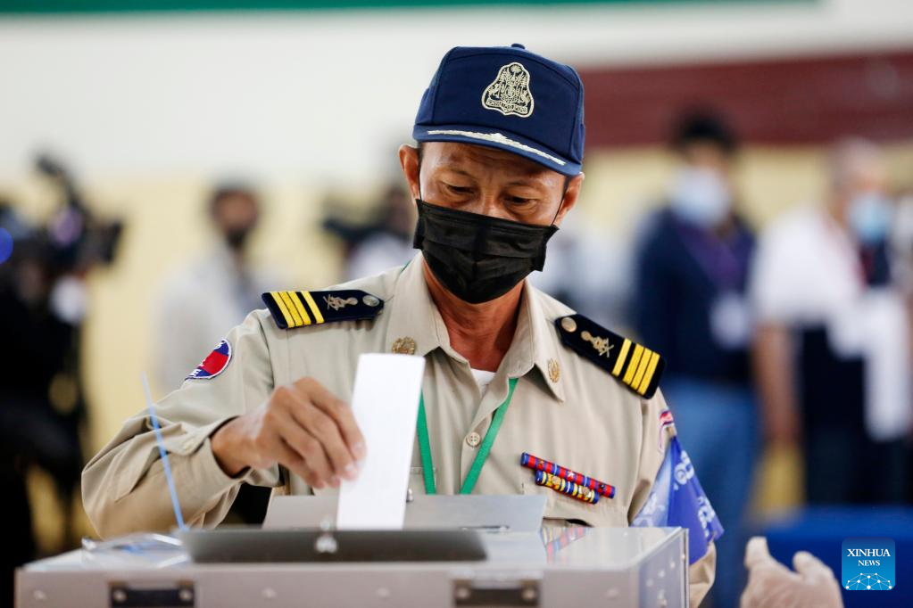 A policeman puts his ballot paper into a ballot box at a polling station during commune elections in Kandal province, Cambodia on June 5, 2022. The fifth commune elections kicked off in Cambodia on Sunday after a two-week peaceful election campaign to choose commune chiefs and councilors for 1,652 communes. (Photo by Sovannara/Xinhua)