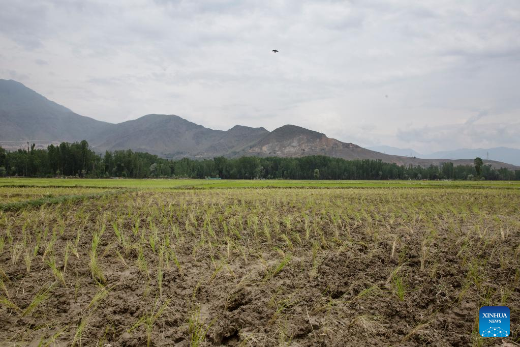 Photo taken on June 17, 2022 shows dried paddy fields at a village in Pulwama district, about 30km south of Srinagar city, the summer capital of Indian-controlled Kashmir. Local water level in rivers that used to irrigate agricultural fields has drastically fallen due to unusual high temperatures. (Xinhua/Javed Dar)