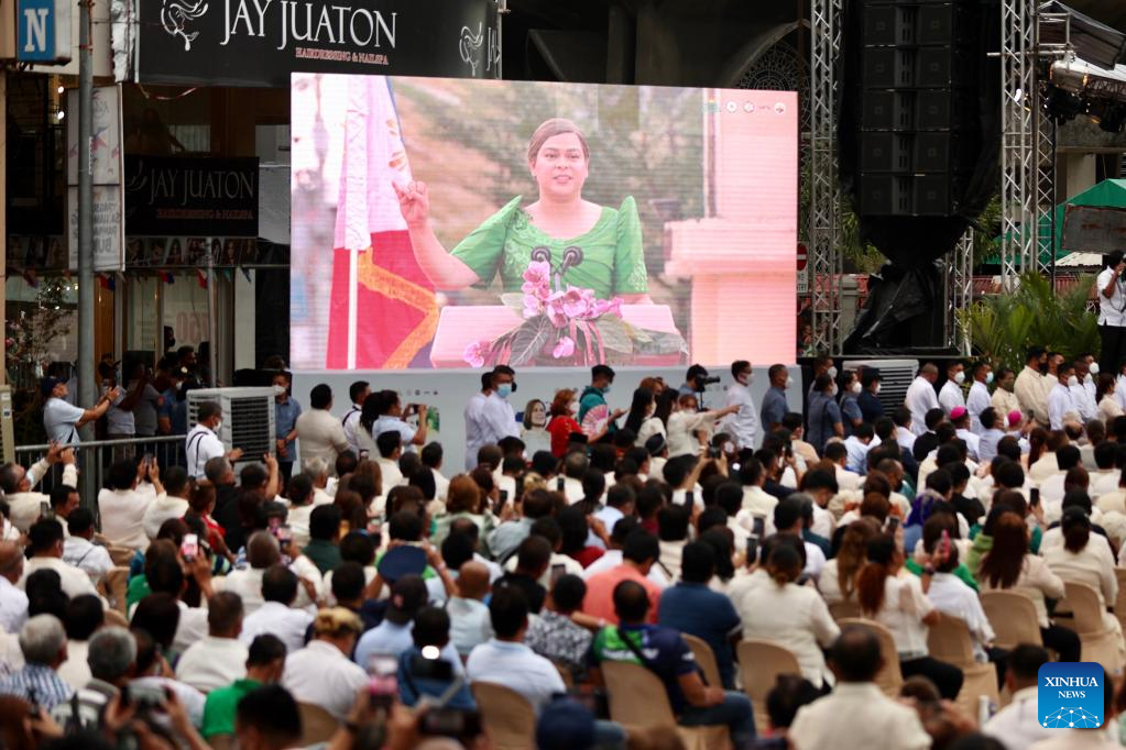 Sara Duterte-Carpio speaks after taking her oath of office as the 15th vice president of the Philippines in Davao City in the southern Philippines, June 19, 2022. A lawyer and former mayor of Davao City, Duterte-Carpio will officially assume office on June 30. Her six-year term ends on June 30, 2028. Duterte-Carpio won by garnering 32.2 million votes, the highest number of votes from all national candidates, in the May 2022 elections and about twice the 16.6 million votes cast for her father in the 2016 presidential race. Duterte-Carpio will also head the Department of Education in the incoming Marcos administration. (Xinhua/Liu Kai)
