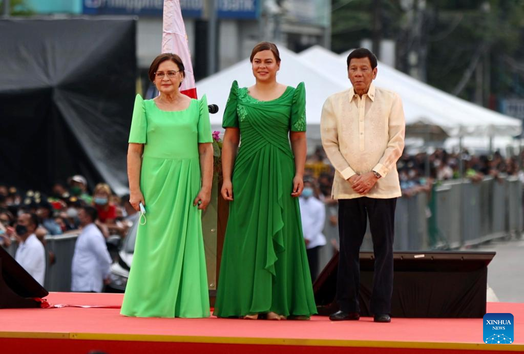 Sara Duterte-Carpio (2nd L) takes her oath of office as the 15th vice president of the Philippines as her father President Rodrigo Duterte (1st R) and her mother Elizabeth standing next to her in Davao City in the southern Philippines, June 19, 2022. A lawyer and former mayor of Davao City, Duterte-Carpio will officially assume office on June 30. Her six-year term ends on June 30, 2028. Duterte-Carpio won by garnering 32.2 million votes, the highest number of votes from all national candidates, in the May 2022 elections and about twice the 16.6 million votes cast for her father in the 2016 presidential race. Duterte-Carpio will also head the Department of Education in the incoming Marcos administration. (Xinhua/Liu Kai)