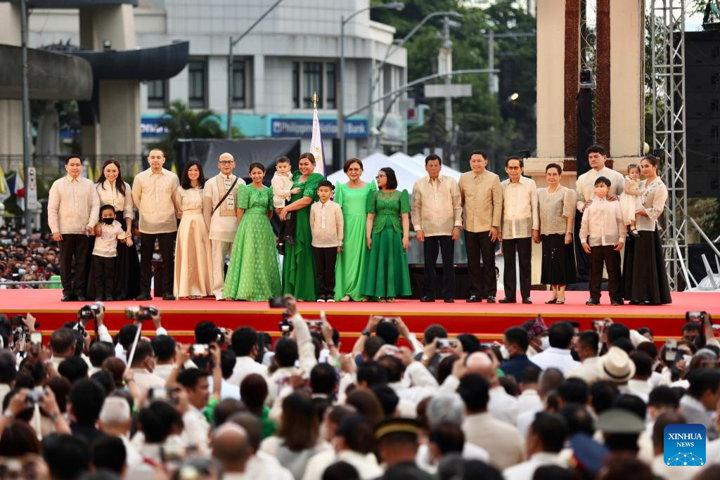 Sara Duterte-Carpio poses for photos with her family members after taking her oath of office as the 15th vice president of the Philippines in Davao City in the southern Philippines, June 19, 2022. A lawyer and former mayor of Davao City, Duterte-Carpio will officially assume office on June 30. Her six-year term ends on June 30, 2028. Duterte-Carpio won by garnering 32.2 million votes, the highest number of votes from all national candidates, in the May 2022 elections and about twice the 16.6 million votes cast for her father in the 2016 presidential race. Duterte-Carpio will also head the Department of Education in the incoming Marcos administration. (Xinhua/Liu Kai)