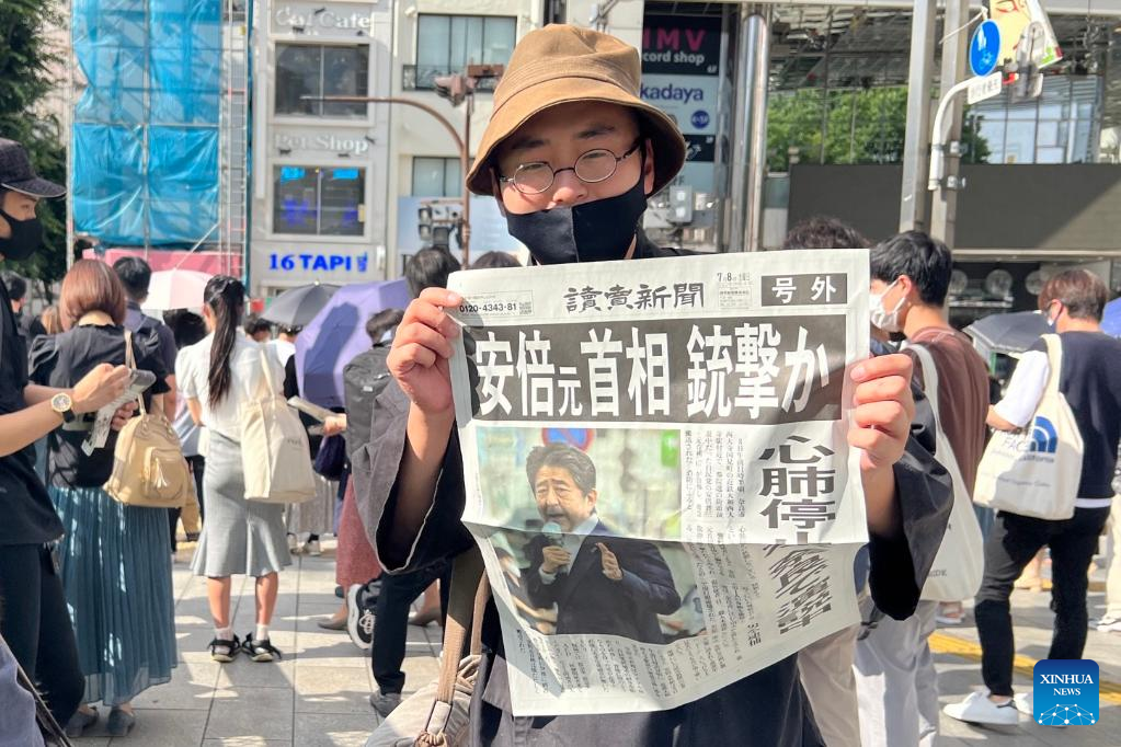A man shows an extra edition of the Yomiuri Shimbun newspaper reporting on the shooting of former Japanese Prime Minister Shinzo Abe, on a street in Tokyo, Japan, July 8, 2022. (Photo by Sun Jialin/Xinhua)
