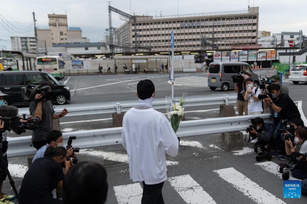 A citizen mourns at the site where late former Japanese Prime Minister Shinzo Abe was shot in Nara, Japan, July 8, 2022. Former Japanese Prime Minister Shinzo Abe was pronounced dead on Friday after being shot twice by an ex-Maritime Self-Defense Force (MSDF) worker while he was delivering a speech in the western prefecture of Nara.