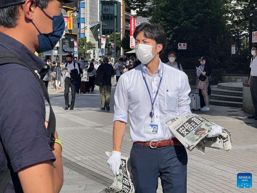 A staff member distributes copies of an extra edition of the Yomiuri Shimbun newspaper reporting on the shooting of former Japanese Prime Minister Shinzo Abe, on a street in Tokyo, Japan, July 8, 2022. (Photo by Sun Jialin/Xinhua)