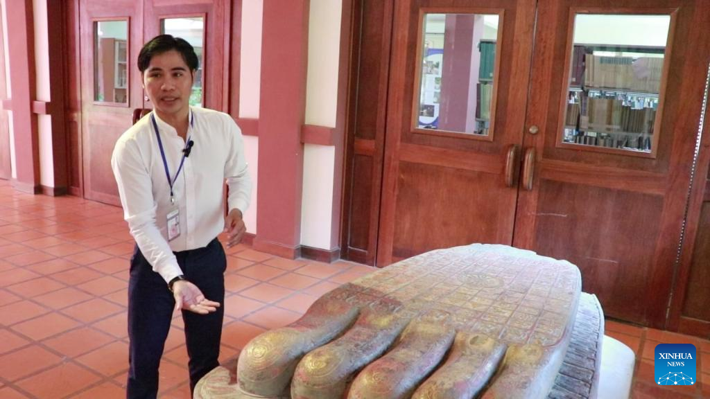 Undated photo shows a staff member introducing a large sandstone Buddha foot statue at the Preah Norodom Sihanouk-Angkor Museum in Siem Reap province, Cambodia. A restored sandstone Buddha foot statue and six ancient wooden Buddha statues are on display at the Preah Norodom Sihanouk-Angkor Museum in Cambodia's northwestern Siem Reap province, the Apsara National Authority (ANA) said in a news release on Friday. (ANA/Handout via Xinhua)