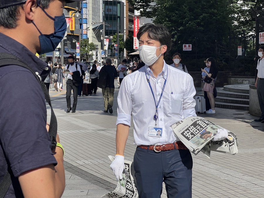 A staff member distributes copies of an extra edition of the Yomiuri Shimbun newspaper reporting on the shooting of Shinzo Abe, on a street in Tokyo, Japan, July 8, 2022. (Photo by Sun Jialin/Xinhua)