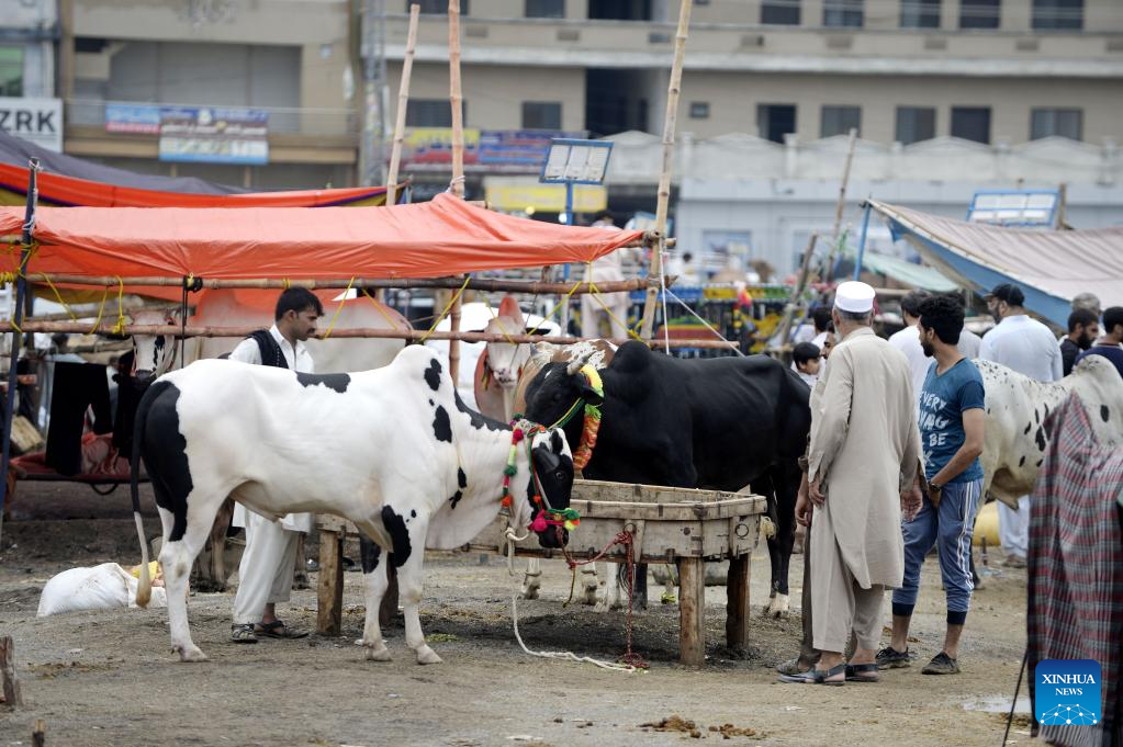 People visit a cattle market to buy animals on the outskirts of Rawalpindi, Pakistan on July 9, 2022. Eid al-Adha always sees people splurging money on new dresses, gifts, and especially sacrificial animals, however, rising inflation and the critical situation of Pakistan's economy have seriously affected the purchasing power of the people, as prices of various commodities are at the highest levels. (Xinhua/Ahmad Kamal)