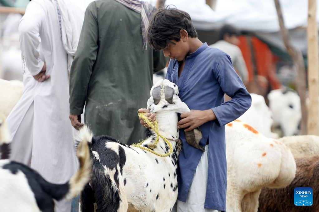 A boy plays with his goat at a cattle market on the outskirts of Rawalpindi, Pakistan on July 9, 2022. Eid al-Adha always sees people splurging money on new dresses, gifts, and especially sacrificial animals, however, rising inflation and the critical situation of Pakistan's economy have seriously affected the purchasing power of the people, as prices of various commodities are at the highest levels. (Xinhua/Ahmad Kamal)