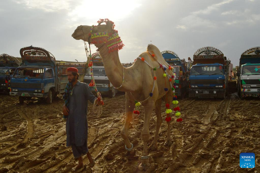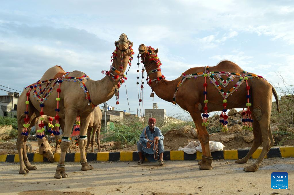 A camel trader waits for customers in Karachi, Pakistan on July 9, 2022. Eid al-Adha festivities are in full swing in Pakistan, marked by sacrificing of animals, special congregational prayers, shopping sprees, family reunion, splendid feasts and charities. However, rising inflation and the critical situation of the national economy have seriously affected the purchasing power of the people, as prices of various commodities are at the highest levels. (Str/Xinhua)