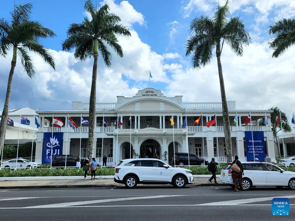 Photo taken on July 12, 2022 shows the Grand Pacific Hotel, the venue for the 51st Pacific Islands Forum (PIF) leaders' meeting in Suva, Fiji.