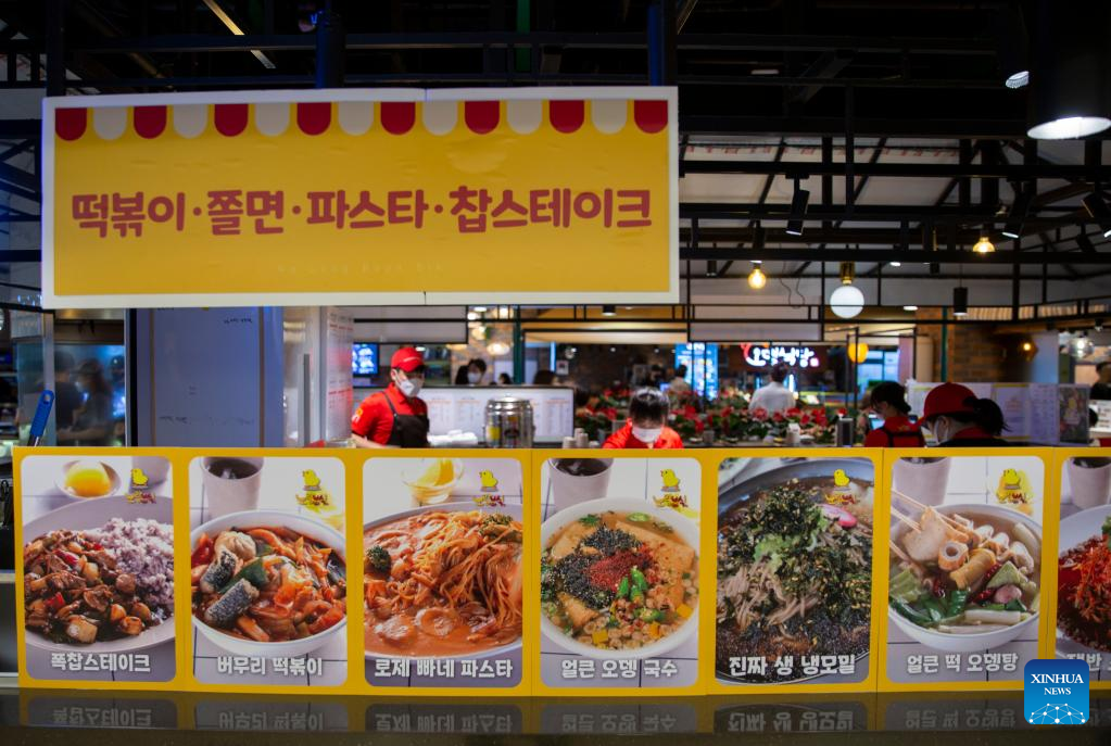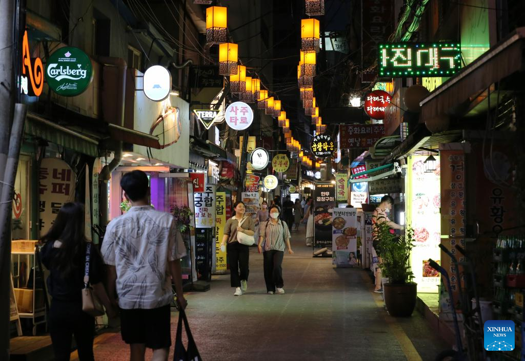 People walk on a food street during dinnertime in Seoul, South Korea, July 18, 2022. According to government data, the average price of eating-out in the first half of this year was up 6.7 percent from the same period last year. (Xinhua/Wang Yiliang)