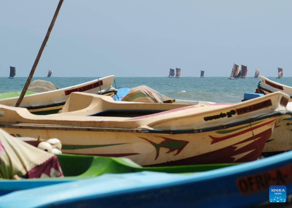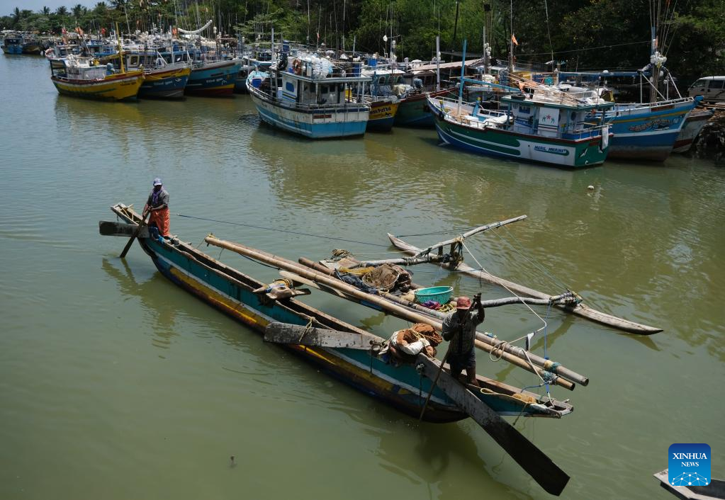 Boats berth at a fishing village in Negombo, Sri Lanka, July 26, 2022. Due to the shortage of fuel oil, many Sri Lankan fishermen turned to traditional man-powered sailboats to fish for a living. (Xinhua/Wang Shen)