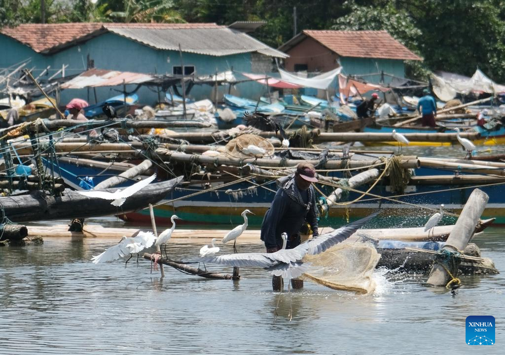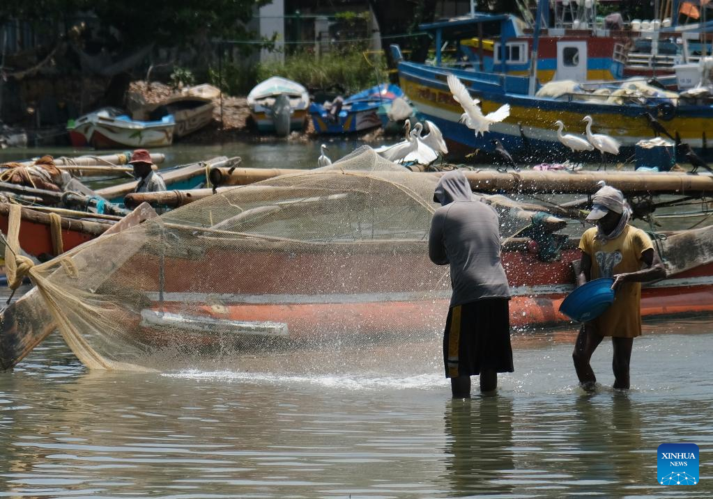 Fishermen work at a fishing village in Negombo, Sri Lanka, July 26, 2022. Due to the shortage of fuel oil, many Sri Lankan fishermen turned to traditional man-powered sailboats to fish for a living. (Xinhua/Wang Shen)
