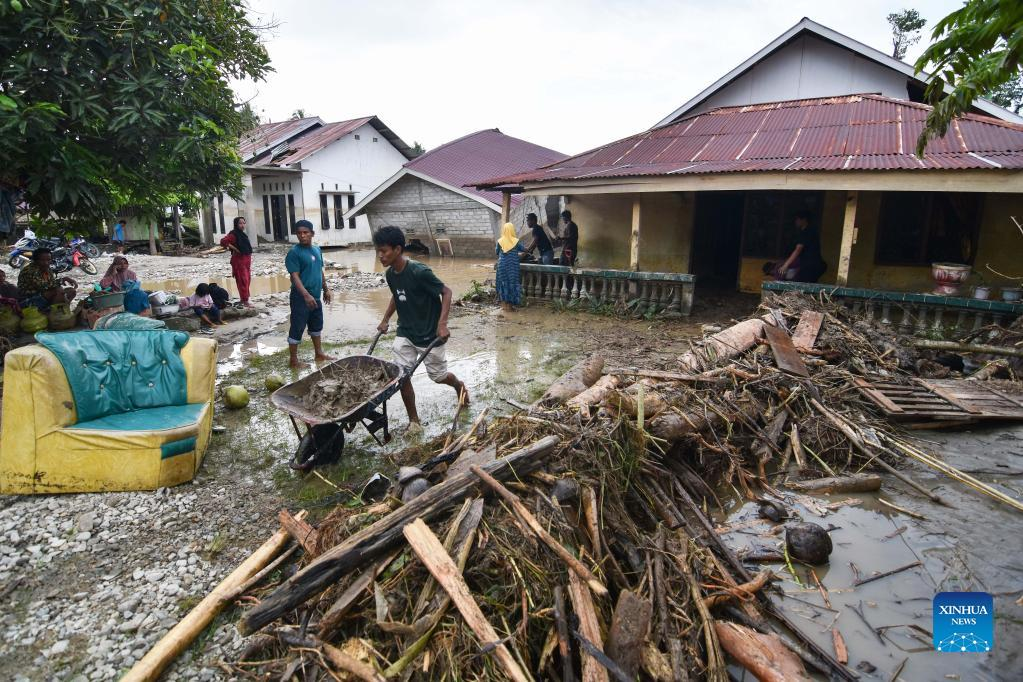 People clean mud from their houses after flash flood hits the Torue Village of the Parigi Mutong District, Central Sulawesi, Indonesia, July 29, 2022. Three people were killed and four others went missing as flash floods struck Indonesia's province of Central Sulawesi, and a search operation for the missing is underway, a senior local disaster agency officer said on Friday. (Photo by Adi Pranata/Xinhua)