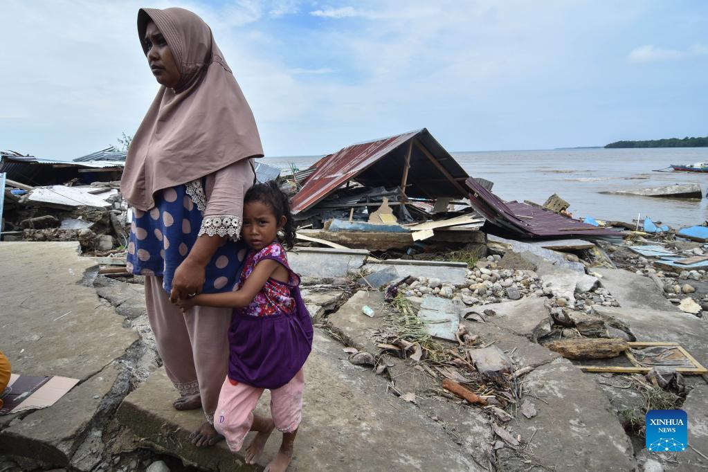 People stand in front of damaged houses after flash flood hits the Torue Village of the Parigi Mutong District, Central Sulawesi, Indonesia, July 29, 2022. Three people were killed and four others went missing as flash floods struck Indonesia's province of Central Sulawesi, and a search operation for the missing is underway, a senior local disaster agency officer said on Friday. (Photo by Adi Pranata/Xinhua)