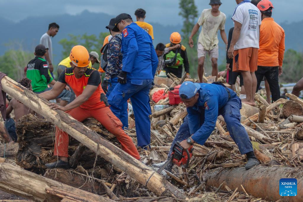 Search and Rescue (SAR) team members search for flood victims at Torue Village in Parigi Mutong District, Central Sulawesi, Indonesia, July 30, 2022. Three people were killed and four others went missing as flash floods struck Central Sulawesi, and a search operation for the missing is underway. (Photo by Adi Pranata/Xinhua)
