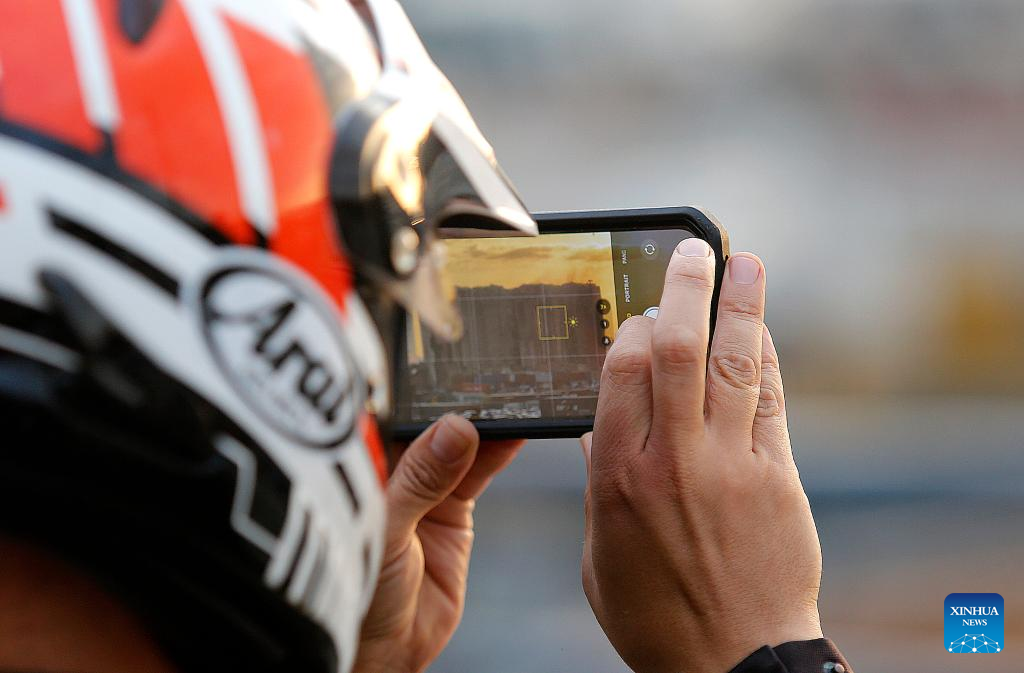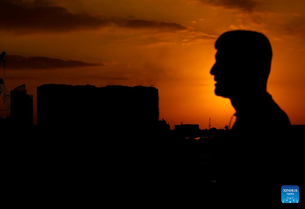 A man takes a photo of the Beirut port grain silos after its northern part collapsed in Beirut, Lebanon, July 31, 2022. The northern part of the Beirut port grain silos collapsed on Sunday after being on fire for weeks, causing a huge cloud of dust, the National News Agency reported. (Xinhua/Bilal Jawich)