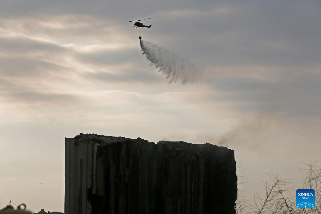 A helicopter dumps water on the Beirut port grain silos after its northern part collapsed in Beirut, Lebanon, July 31, 2022. The northern part of the Beirut port grain silos collapsed on Sunday after being on fire for weeks, causing a huge cloud of dust, the National News Agency reported. (Xinhua/Bilal Jawich)