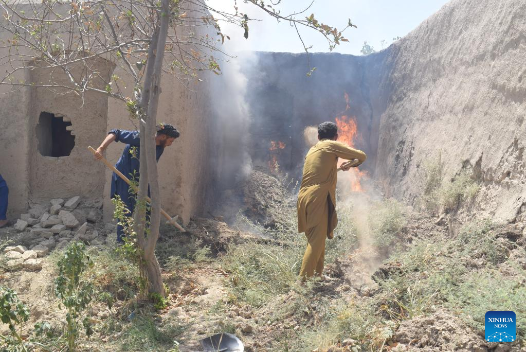 People battle a natural fire in a residential area in Jawzjan province, Afghanistan, on Aug. 10, 2022. At least 50 residential houses have been burned to ashes by natural fire in the northern province of Jawzjan since Monday, provincial police chief Damullah Serajuddin Ahmadi said Wednesday. (Photo by Zekrullah Yazdani/Xinhua)