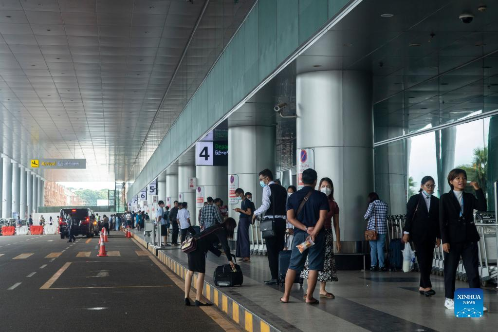 People stand in front of the departure lounge at the Yangon International Airport in Yangon, Myanmar, on Aug. 12, 2022. Myanmar welcomed 42,315 foreign tourists between April and June, up 22.9 percent year-on-year, according to the Ministry of Hotels and Tourism. (Photo by Myo Kyaw Soe/Xinhua)